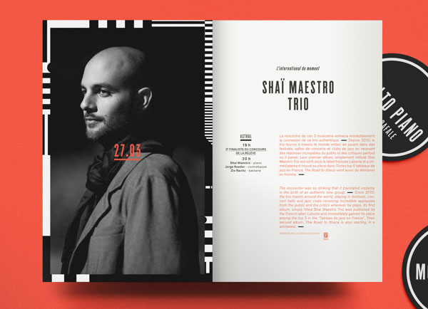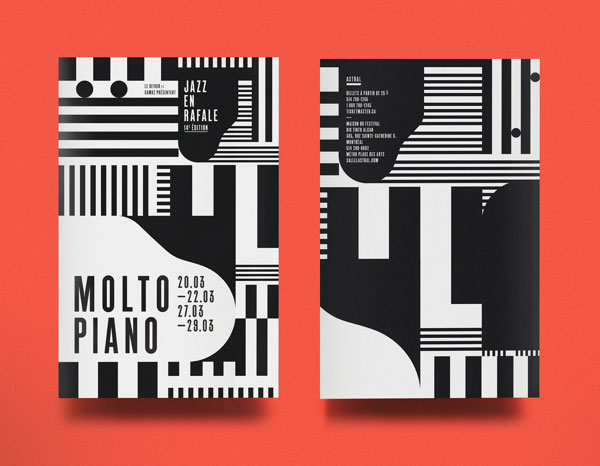 This asymmetric pattern relies on a monochrome colour scheme to accentuate the dramatic effect. The brochure is advertising a jazz festival, and on closer inspection the black and white shapes take the form of piano keys and musical notes, allowing the event it is promoting to live through the layout. The Montreal-based event was adapted for other promotional material such as posters and flyers which have since been collected and sold as art pieces for the home.
