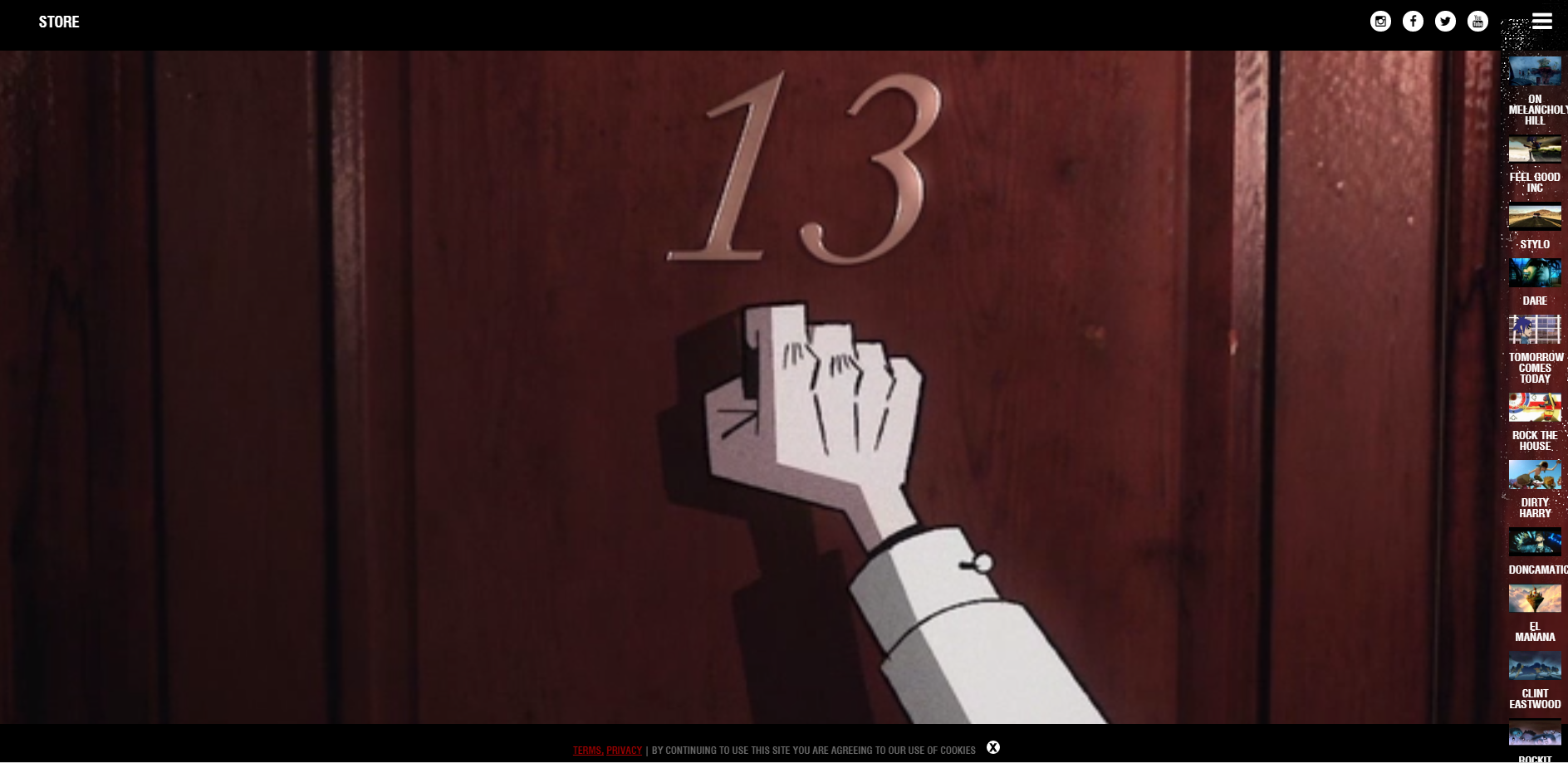 The entire homepage fills with state of the art animation guiding you through a story, with a minimal sidebar letting you choose whether you want to take a look at a past album, buy merchandise or just admire the character creation.