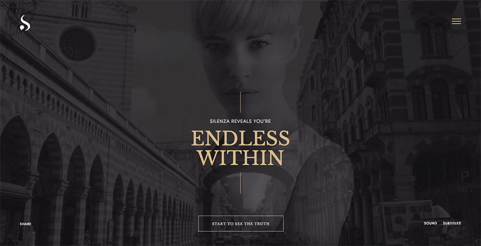 Silenza is a women’s lingerie brand whose website is a fusion of interactive design, video montages and storytelling. Once you enter the site, you have the option to connect with your mobile for a more personalised experience. The site utilises the “hamburger menu” style on its landing page, which allows the designer to play with complex background effects whilst retaining an easy navigation system that users recognise.