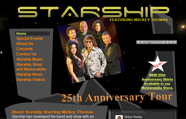 Mickey Thomas’s website advertising the 25th Anniversary Tour looks like it hasn’t been updated since the first show in the last century. The design looks fresh out of a Clip Art palette, and needs a definite re-vamp if it’s to sell hard tickets for Starship’s long awaited return!